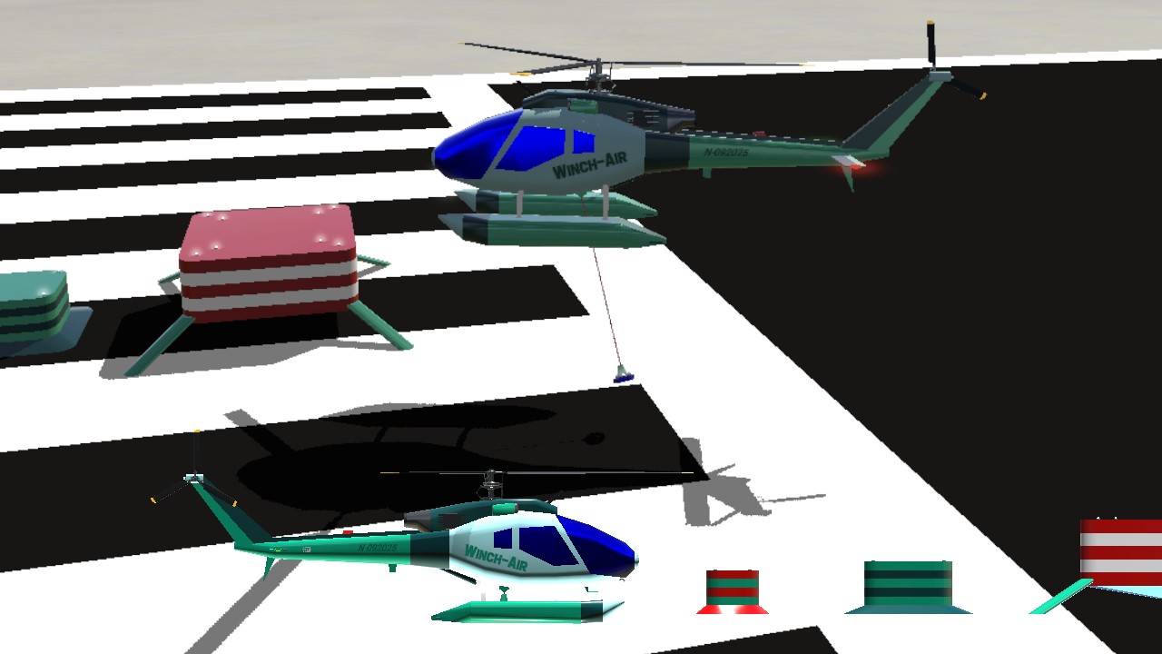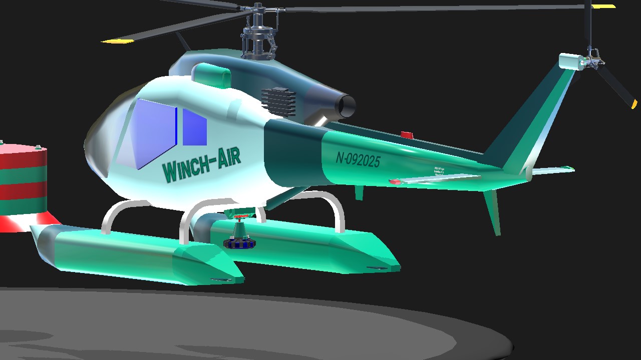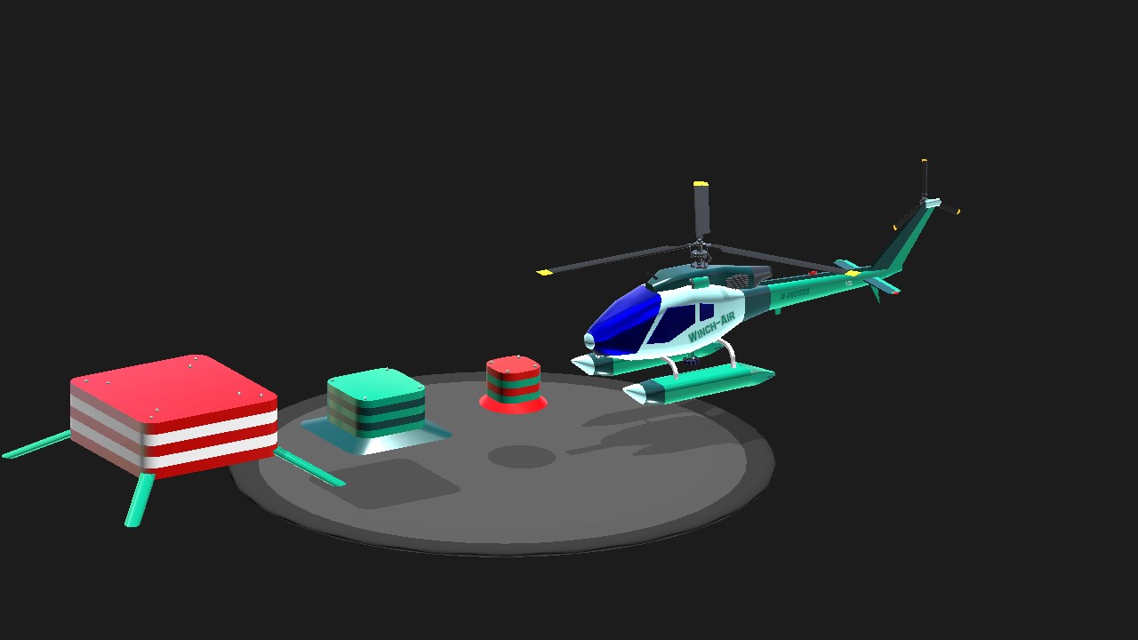 WinsWings' magnificent Vireo 925 helicopter, equipped with a winch. after WinsWings posted his own version as a rescue helicopter, I set out to tweak its winch/pickup capacities by writing some code for hovering and also play with the controls. I'm still nowhere near my goal to be able to launch and pick up a rescue diver from a hovering helicopter but I already included three dummy targets you can practice on..I am pretty decent in picking up the largest one already. As for the rest: detailed instructions are in the 'instruction' tab.