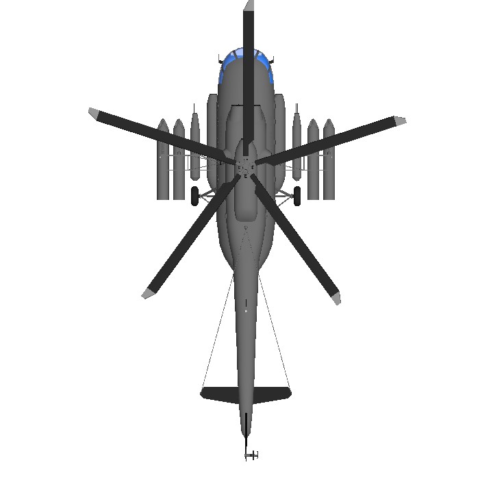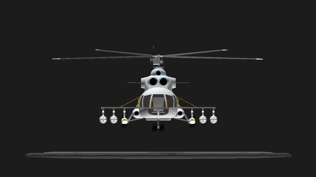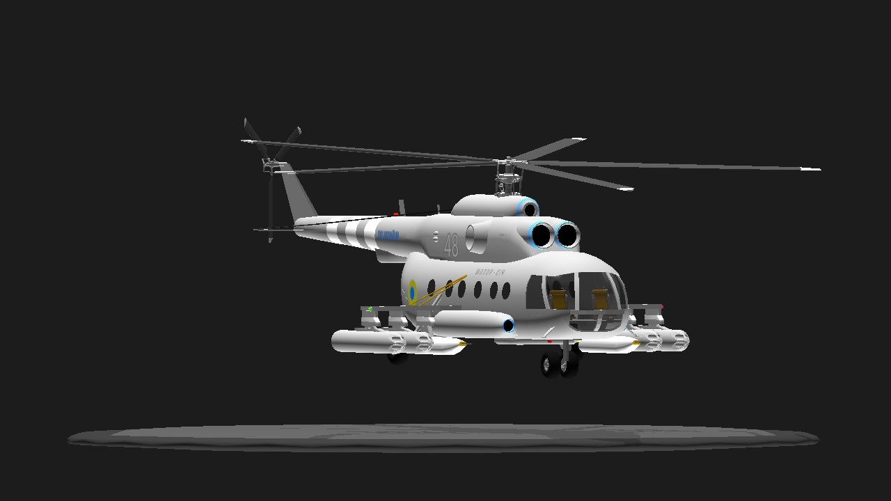 So basically its three creators' creations mashed into one assault transport heli.... Thanks to ReinMcDeer for gun pod fuselage, thanks to Rimiha for the mi-8, and thanks to ManManTheWeaponsMan for rocket pods.... since the troop carrying comartment can open(Rimiha made this), it can be used for SPMP(SimplePlanesMultiPlayer).