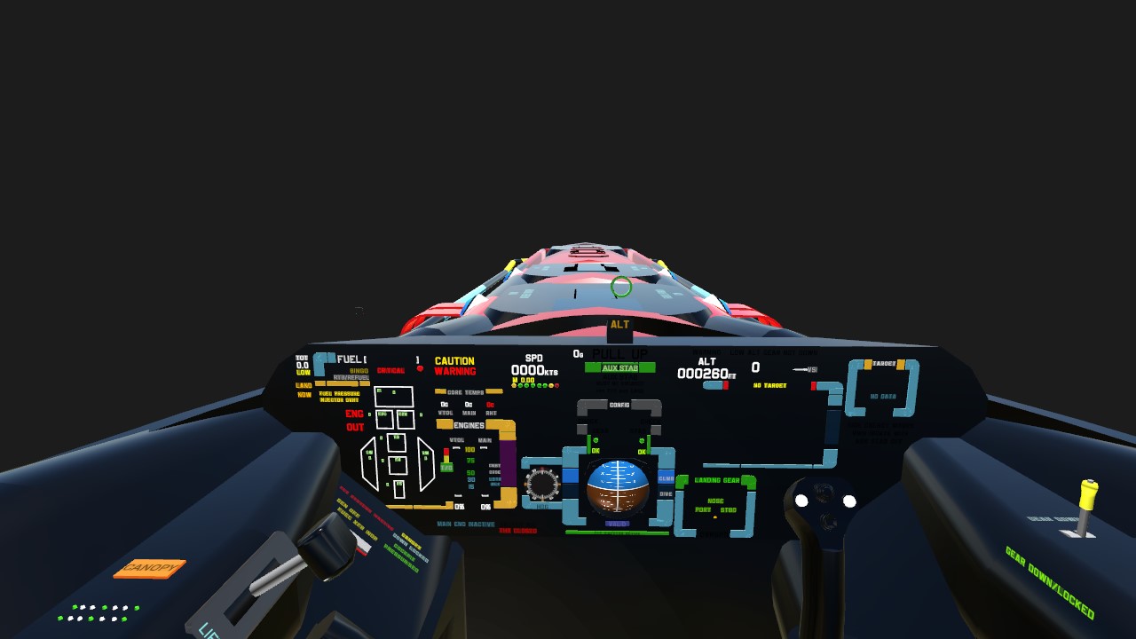 The ship is powered by a Rolls-Royce Thrust Tunnel with Reheat. In the cockpit you’ll find LCARS style displays that present all information necessary for operation of the craft. Despite my very limited programming ability, the displays give even the most basic pilot the information necessary to avoid becoming a lawn-dart or a high-speed Titanic clone.