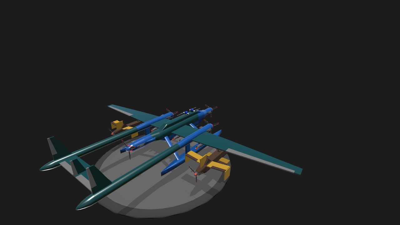 The aircraft shown in the entry is fitted as a long-range torpedo bomber, and showcases not only the Skofnung's great carrying capacity, but also a peculiar use of the Tyrving: normally, a Skofnung outfitted with this many torpedos and loaded up to the gills with fuel like this one would be incapable of takeoff. However, by including two extra engines in the form of Tyrvings, this machine can lift a terrifying eight large torpedoes. While it's not the case in this example, Tyrvings can even be fitted with extra fuel tanks instead of a payload and skids to allow them to return to base after takeoff.