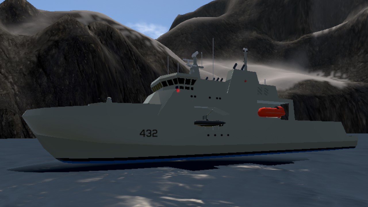 This build has a mid-range part count at around 600 parts, making it mobile-friendly and stable across all platforms. It features functional lifeboats, a working BAE Mk 38 naval gun, realistic rolling when turning, and detailed shaping that stays close to the real vessel’s appearance.