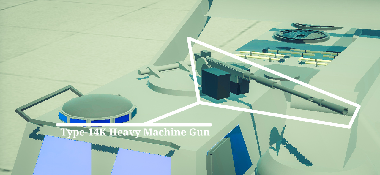 For self-defense, the ZEV-5 Kodiak is equipped with a Type-14K heavy machine gun chambered in 14.5×114 mm. The weapon is capable of penetrating lightly armored Mizuharan vehicles and can be operated via a remote-controlled weapon station from within the vehicle’s protected interior.