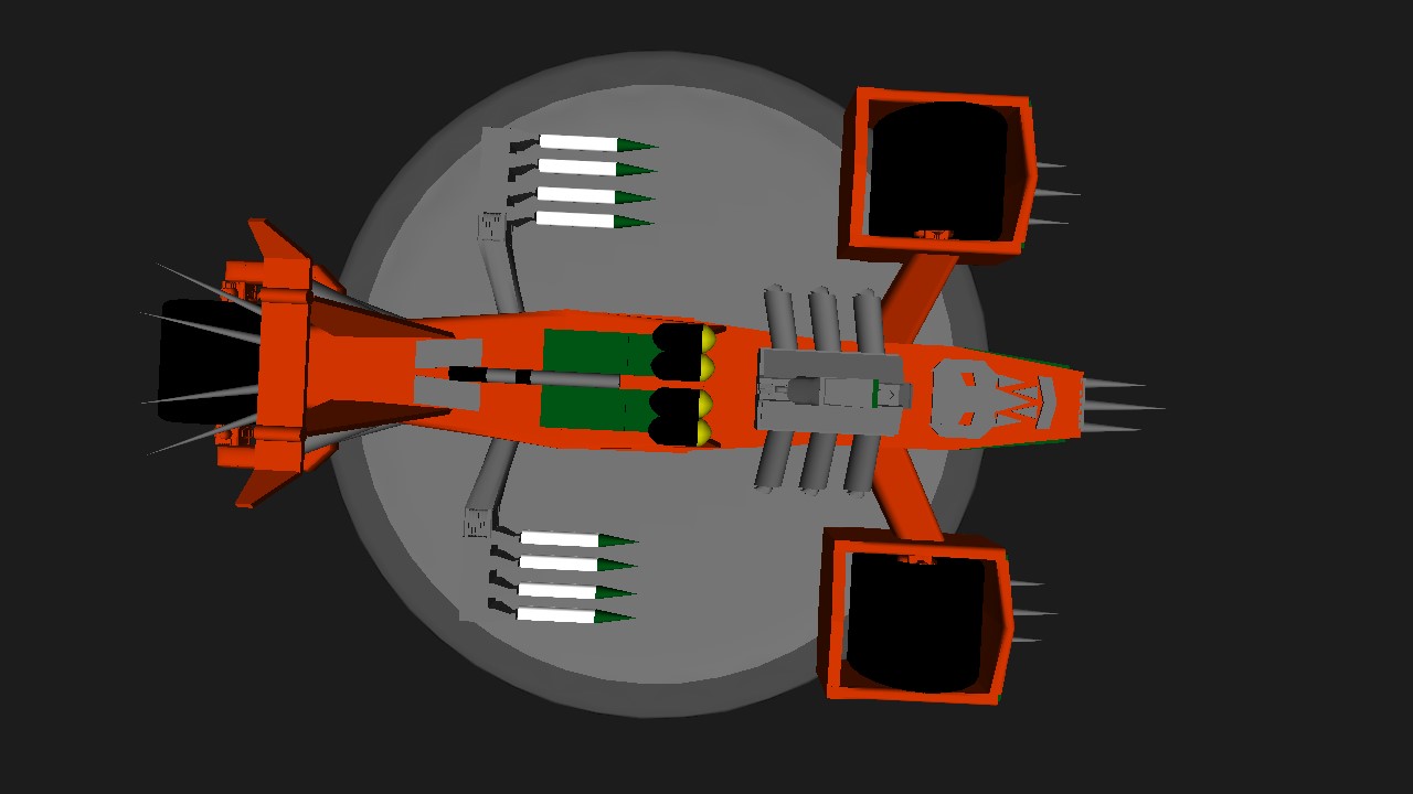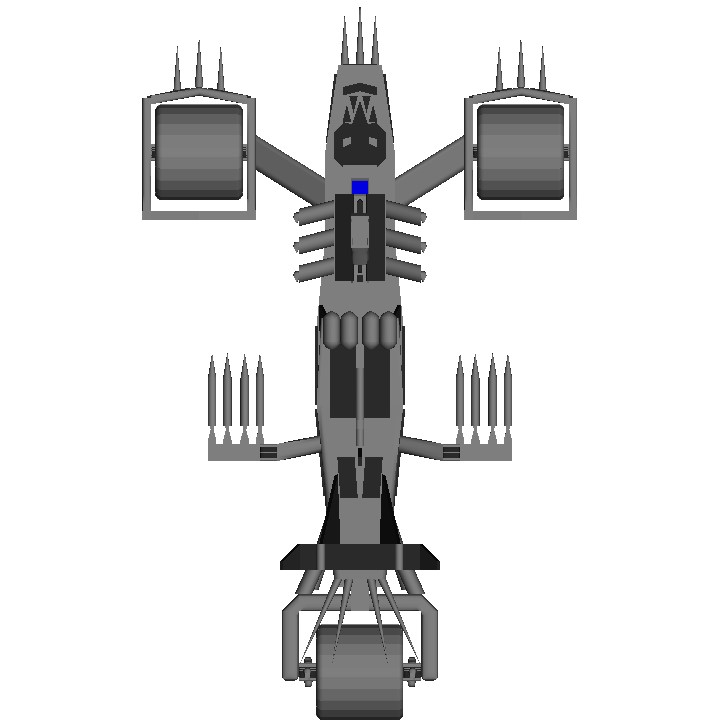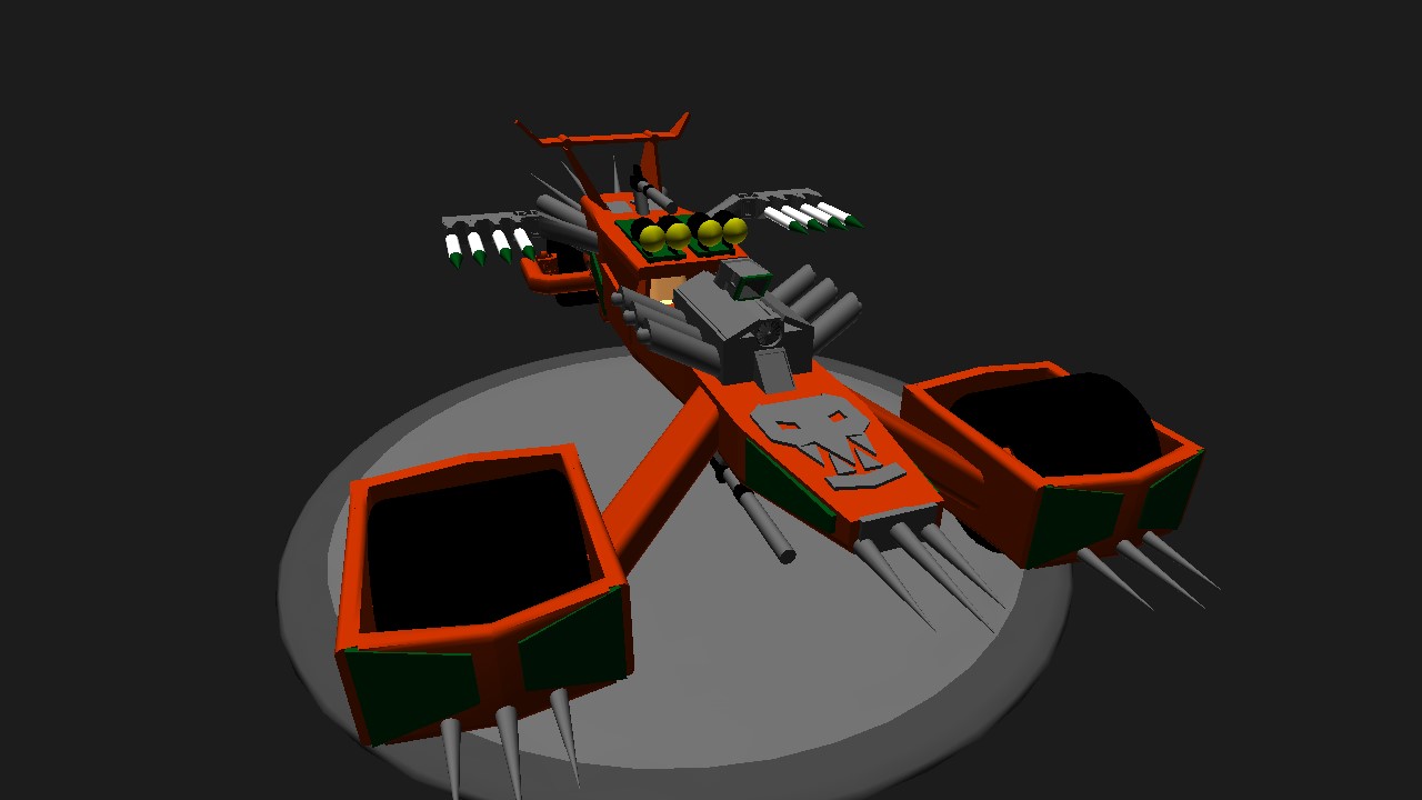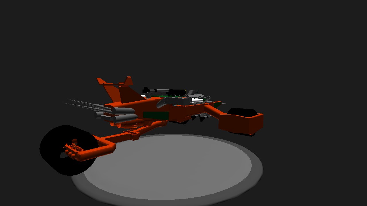This is a land vehicle based on a Mad Max aesthetics. This vehicle is able to travel on all parts of the island. Use the roll to steer. Use the V-tol to raise and lower the elevation of the vehicle. Use the pitch control to change the angle of the missile launchers. Activate groups 1 through 4 to fire the missiles.