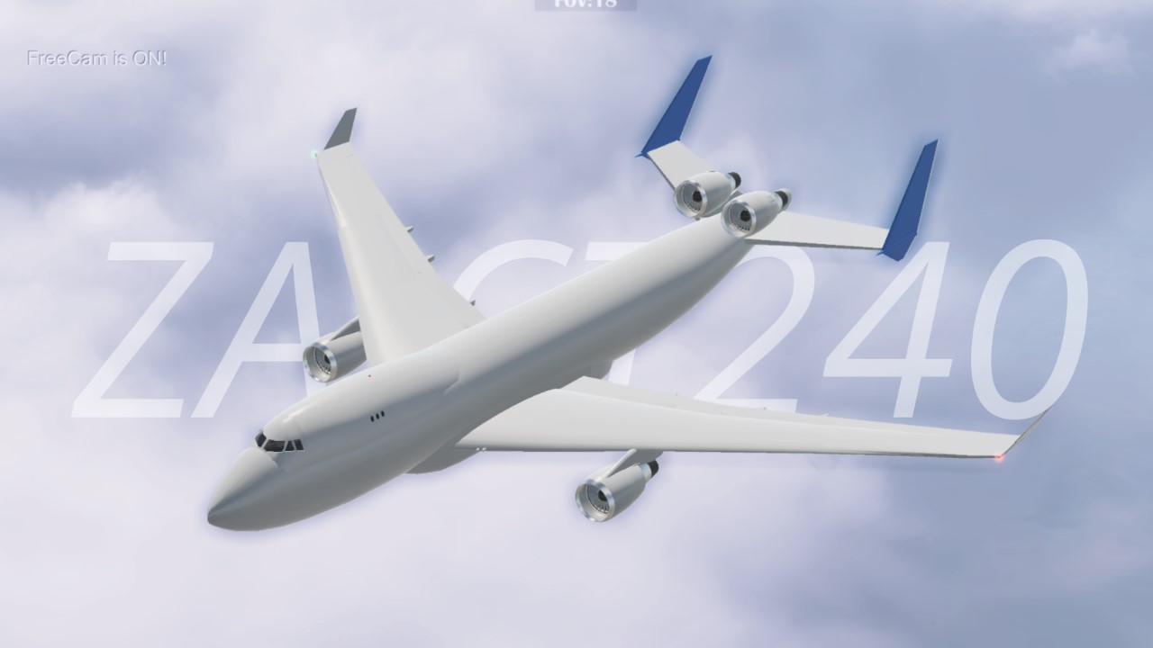 The ZerkkAirborne ZA-CT240 (nickname : Proto) is an experimental heavy cargo planes derived from Boeing 747-400F, it was used for experiment with 2 engines replacement to tail. Only 1 was operated till now, and it was stored in Cynesia airport.