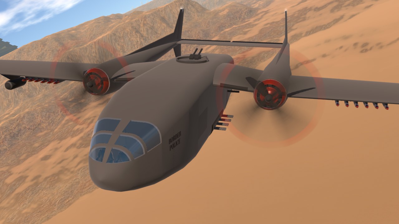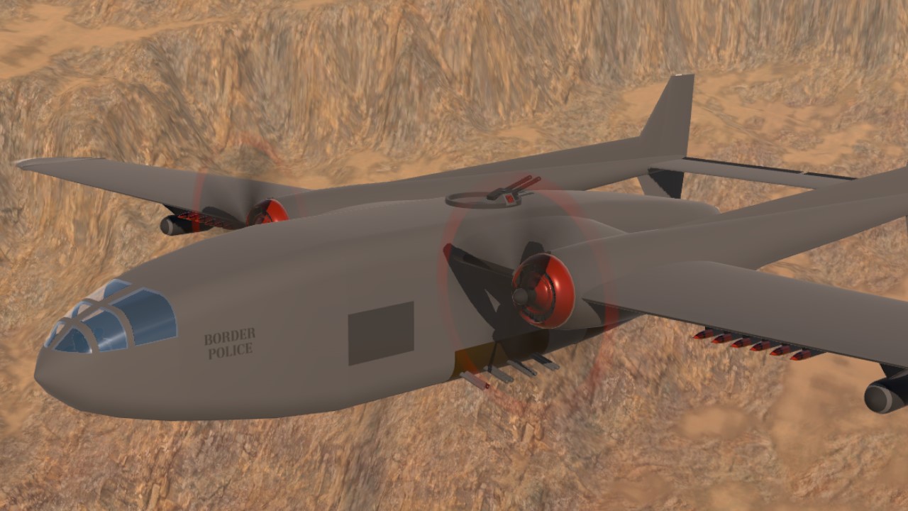 The Seraphim is a mid-sized gunship developed by SMC Aerospace for Imperial Avaricia. Possessing a good range and payload, and armed with eight water-cooled 12.7mm heavy machine guns, two 20mm autocannons, and either two 40mm autocannons or a 75mm howitzer in a side-firing configuration, plus two 12.7mm machine guns and a 7.62mm machine gun as a defensive armament and a dozen 3-inch rockets, the aircraft is designed to operate against massed enemy formations of infantry and light mechanised forces. Used to patrol the Avarician border, maritime patrol and transport variants of the airframe also exist.