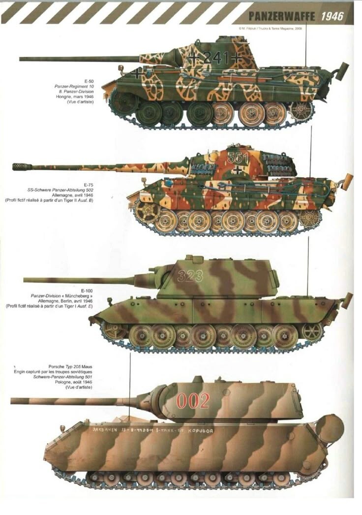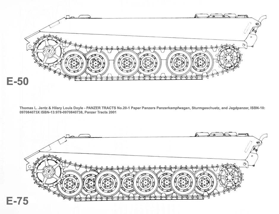 The E-50/E-75 upper front plate was angled at 60 degrees, compared to 55 and 55 for the Panther and Tiger II. Drafts showed that the upper front plate was meant to be 100 and 150 mm thick for the E-50 and E-75 respectively