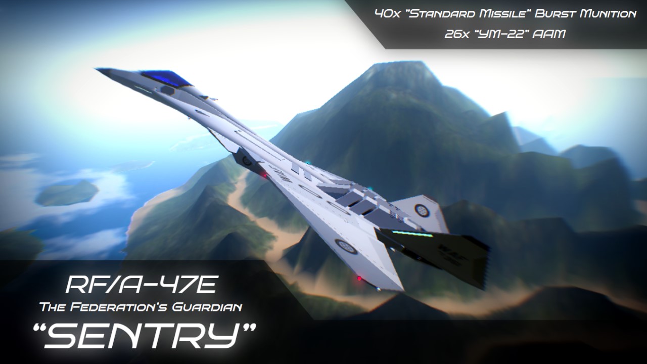 The RF/A-47E is a 5th generation supersonic, all-weather, twin-engine Fighter-Interceptor developed in joint by Rosette and Yukon. it is the fastest aircraft operated by the Wisterian Federation, and their main fighter. It will never be sold unlike the previous Sentry due to this one having more classified tech.
