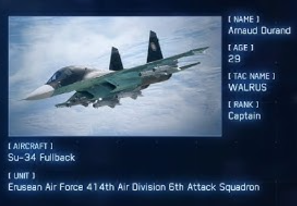 The Su-34 was later utilized in the Lighthouse War by the Erusean Air Force. Two detachments of Su-34s were fielded by the EAF during Operation Sighthound in an attempt to attack the Osean Navy ships approaching Artiglio Port, only for all of the aircraft to be shot down by the LRSSG.[3]Su-34s were also used by the EAF in Operation Giant's Step to defend Farbanti. One of the most notable Erusean Su-34 pilots was Arnaud Durand, callsign "Walrus", who was shot down by Trigger over the Hatties Desert during Operation Dragon Breath, while accompanied by two groups of helicopters who were tasked with attacking and infiltrating Stonehenge.