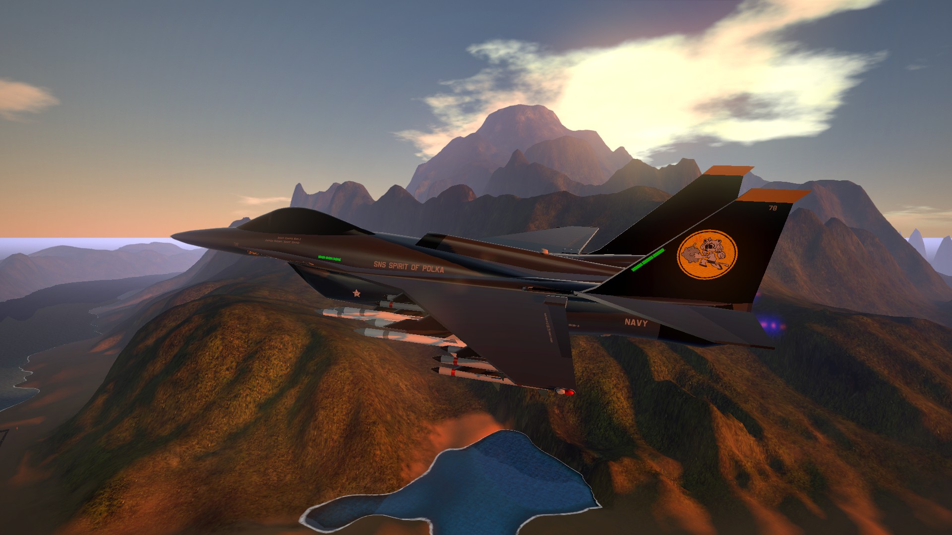 This aircraft is part of Naval Fighter Wing 11 "Ocean's Eleven." They operate a squadron of SCF-68i Sea Ranger I-SPEC fleet defense fighters and are stationed on the SNS Spirit of Polka, an Apollo-class carrier that was christened and entered service in 2021. The aircraft itself is piloted by Captain Michael Nguyen, callsign "Bodan."