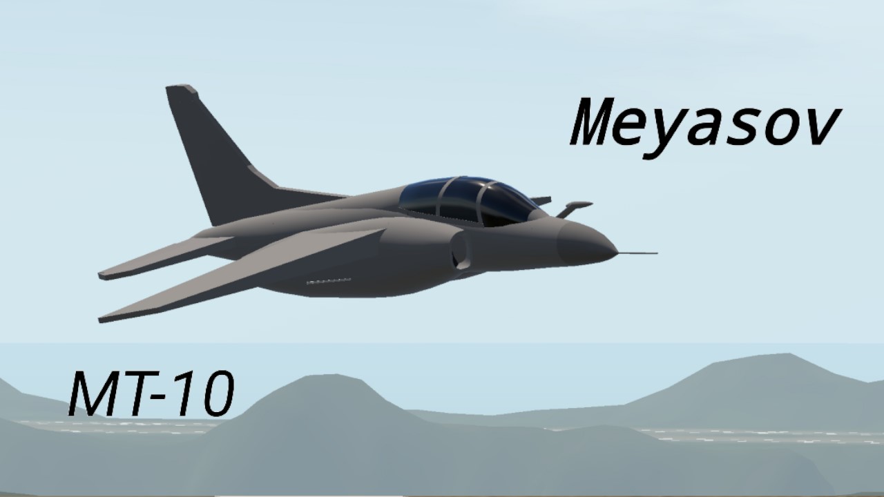 The Meyasov MT-10, nicknamed "Scout" by pilots, is a russian trainer aircraft made by ОКБ МЕЯСОВА(OKB Meyasov). Made in the 1990s, it has been used by many airforces including the Indemarines(more rob lore lol), using 2 Vasilov VT-12 Turbojets which have proved to be very effective during testing in 1992.