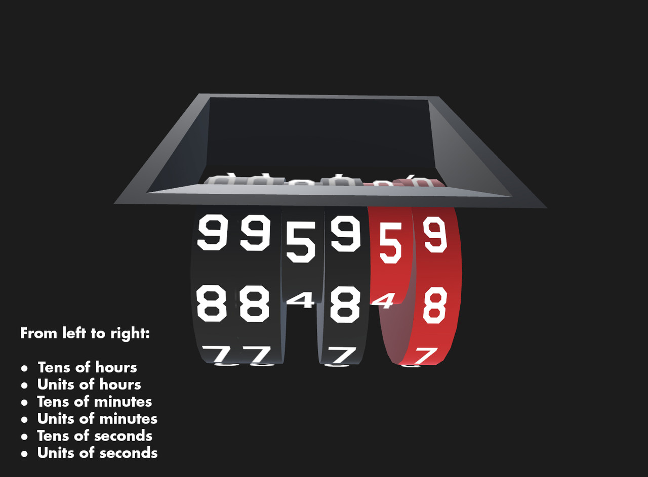 The display is composed of rotating digit drums whose angular positions are continuously updated based on the elapsed time. Each drum advances in discrete steps to represent its assigned time digit.