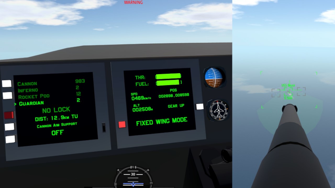 Weapon list and ammo count are shown on the cockpit display